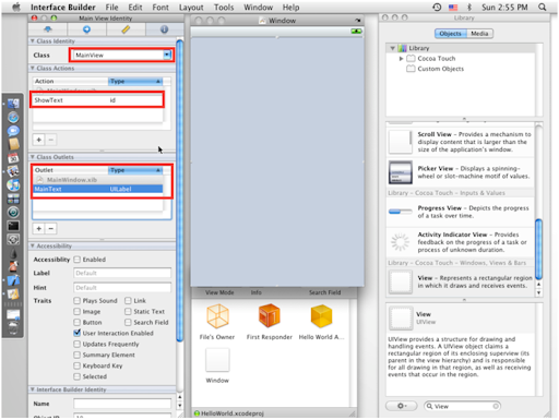 12. MainView 에 Class Name, Action , Outlets 이름 지정 및 추가